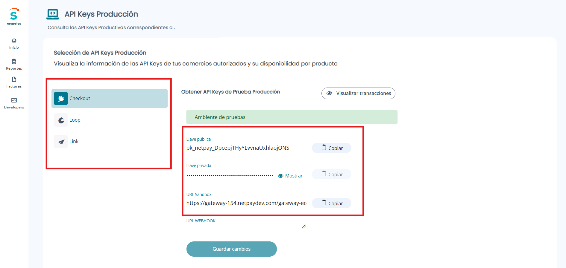 - En el apartado "API Keys Producción", encontrará las categorías de Checkout, Loop y Link. Debe seleccionar la categoría correspondiente según el producto que desee utilizar.