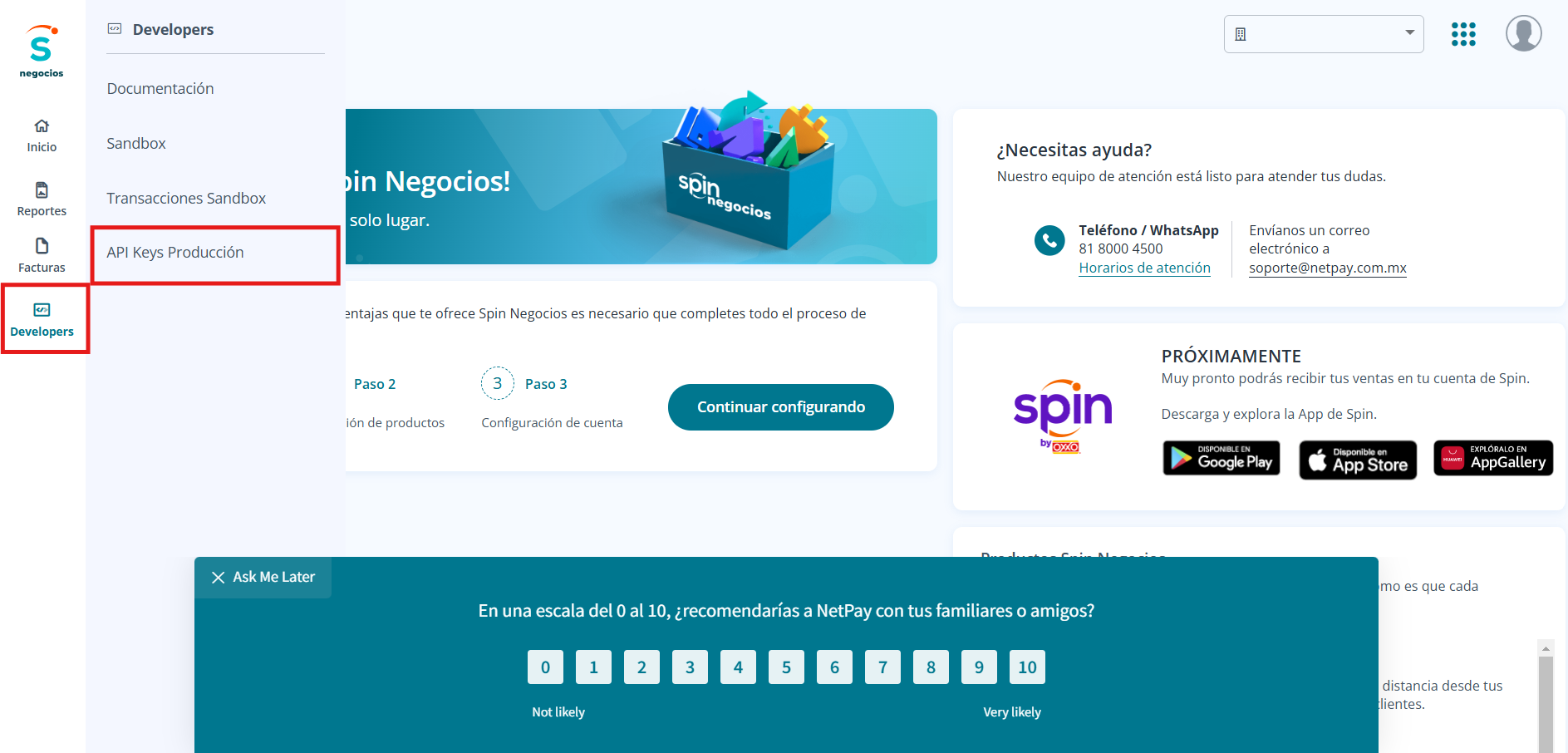 - Una vez que sus llaves productivas hayan sido activadas por el asesor comercial, ingrese a Spin Negocios Manager y acceda a la sección "Developers" en el menú lateral.