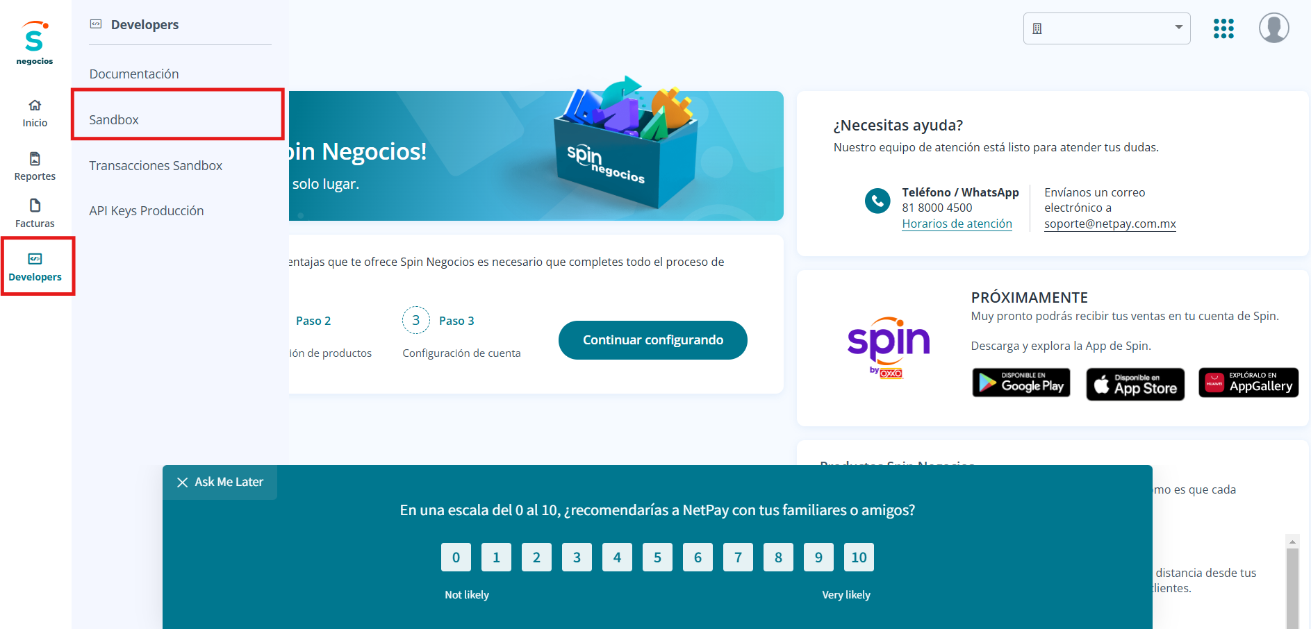 - Ingrese a Spin Negocios Manager y acceda a la sección "Developers" en el menú lateral.