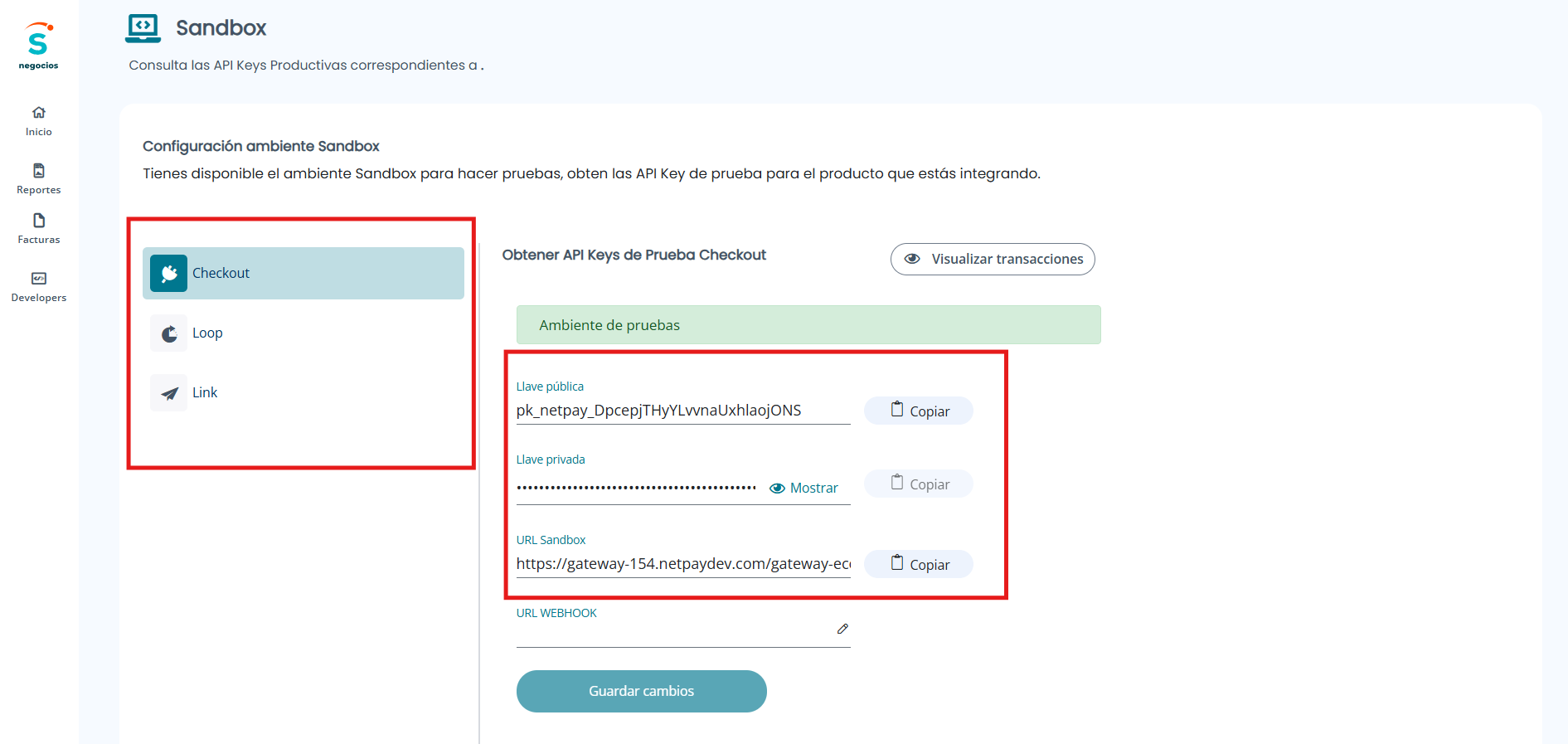 - En el apartado "Sandbox", encontrará las categorías de Checkout, Loop y Link. Debe seleccionar la categoría correspondiente según el producto que desee utilizar.